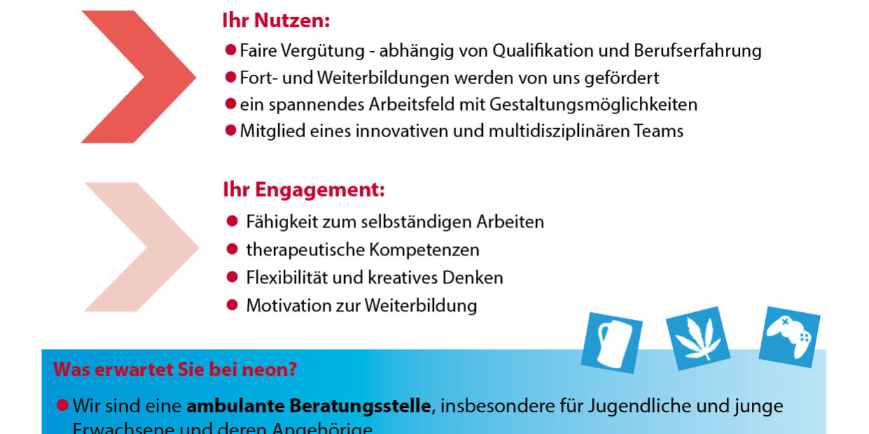 neon betreibt als gemeinnütziger Träger eine Präventionsfachstelle sowie eine Suchtberatungsstelle. Darüber hinaus sind wir in der betrieblichen Gesundheitsförderung tätig. Zur Verstärkung für unser Team in der ambulanten Beratung und Therapie suchen wir zum nächst möglichen Zeitpunkt einen/eine